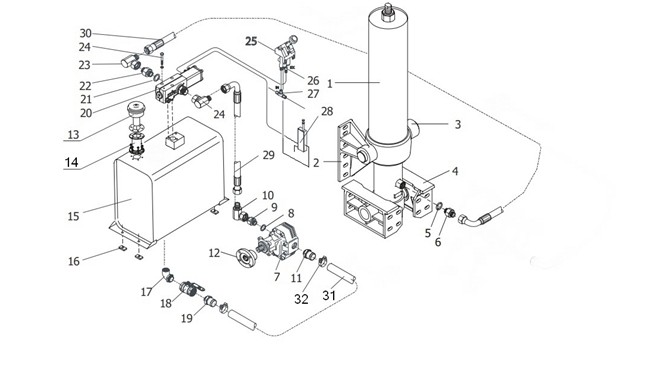 請(qǐng)按照上圖用油管和氣管將全部液壓元件連接進(jìn)來(lái)。確保油管(軟管)長(zhǎng)度足夠長(zhǎng),以免在舉升過(guò)程妨礙油缸的運(yùn)動(dòng)。組裝完成后沒(méi)有必要立即將氣體從油缸中排出,因?yàn)橥ㄟ^(guò)最初的幾" />